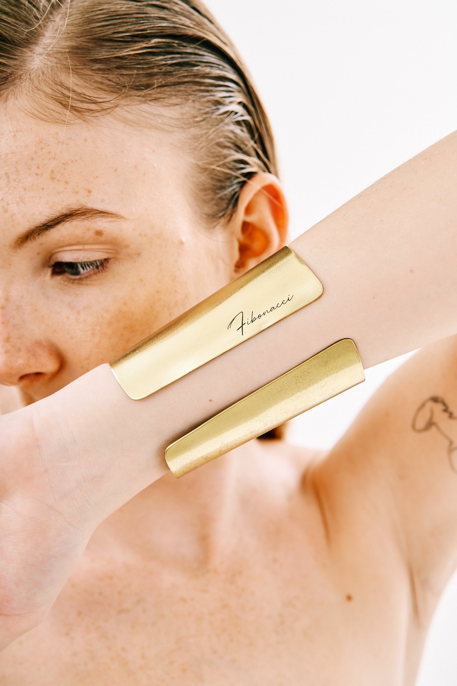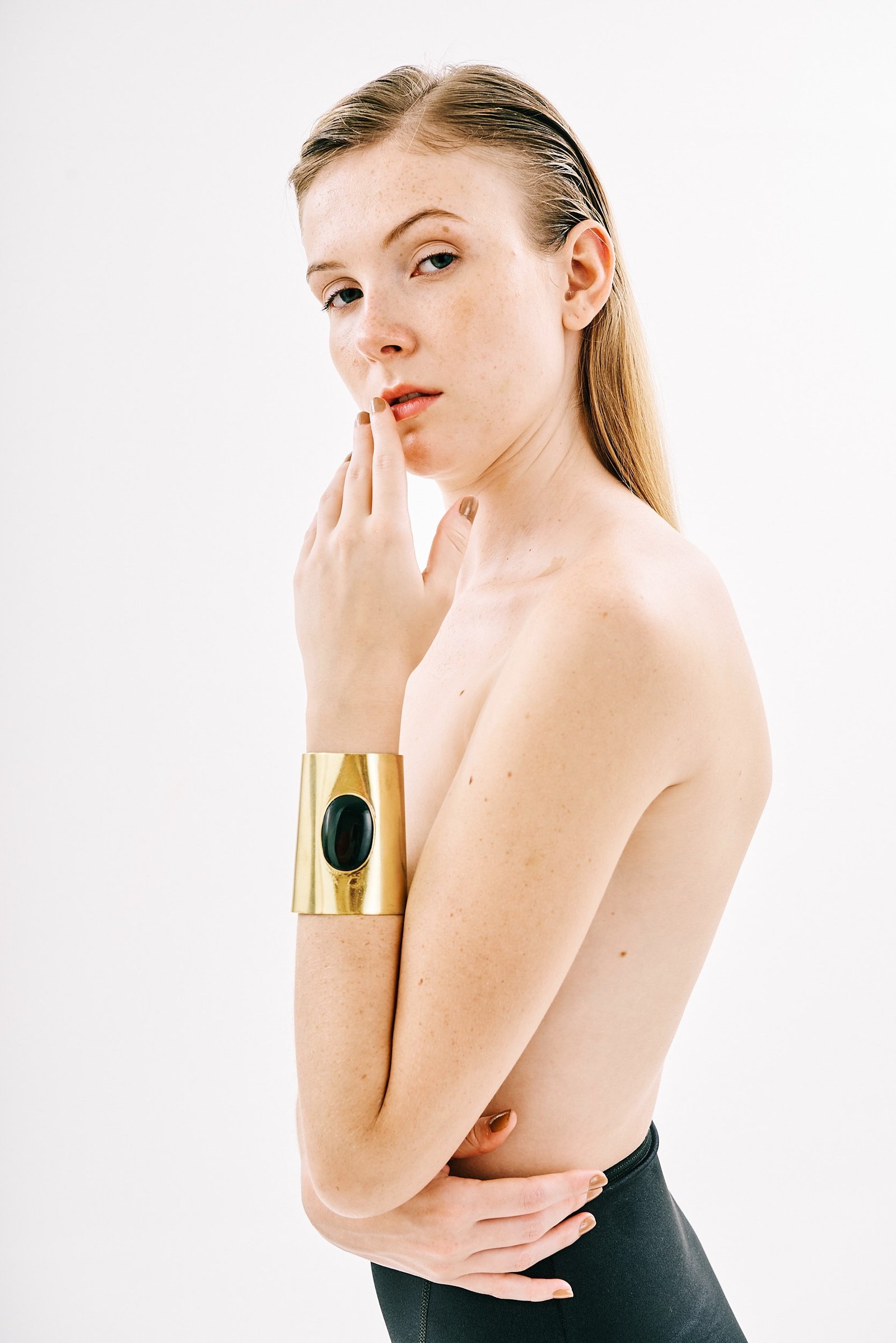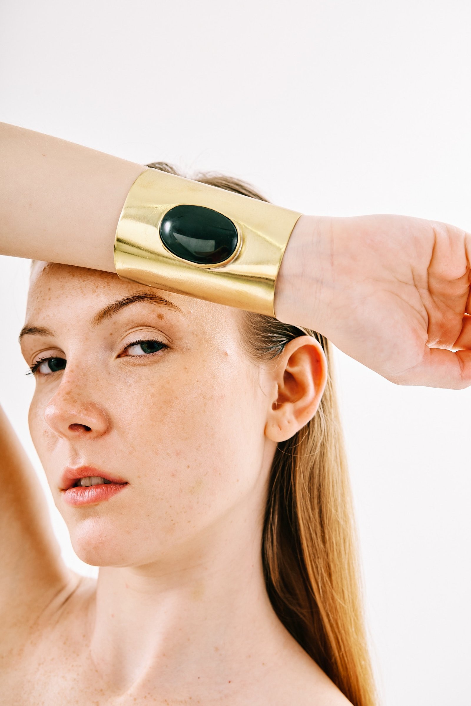Brazalete realizado a mano por nuestra orfebrería en bronce bañado con laca hipoalergénica, con piedra de turmalina natural.