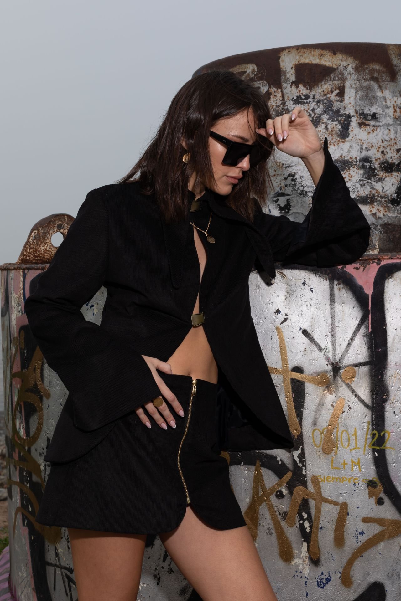 Conjunto confeccionado con tela de corderoy de alta calidad y con forreria sedosa por dentro. Talle S, M, L, hasta agotar stock. Se encuentra en dos colores, negro y lavanda. Lleva un avío de bronce con protección hipoalergénica hecho por nuestros orfebres. Solo limpieza en seco: le recomendamos que utilice un proveedor ecológico que evite los productos químicos agresivos. No planchar. Este es un artículo delicado: recomendamos limpiarlo solo cuando sea realmente necesario y guardarlo en una bolsa para protegerlo del polvo.